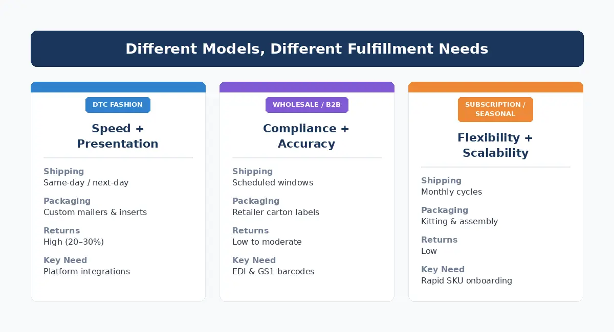 | Fulfillment Need | DTC Fashion | Wholesale / B2B | Subscription / Seasonal |